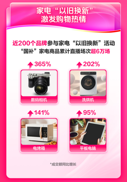 其中,受“国补”影响,家电“以旧换新”也激发了消费者的购物热情。根据抖音官方数据显示,近200个品牌参与家电“以旧换新”活动,“国补”家电商品累计直播场次超6万场。